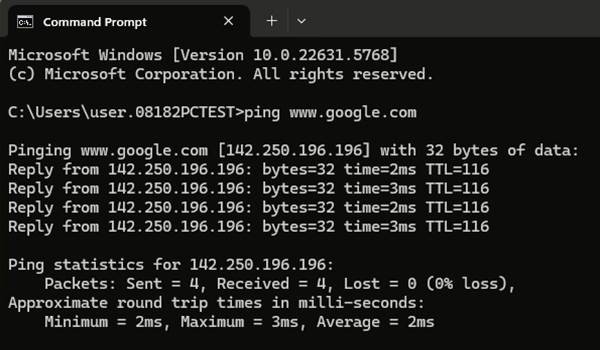 A laptop connected via Ethernet to the M2M device successfully accessed the Internet through the LAN-as-WAN configuration, with stable connectivity verified by running ping www.google.com in Windows Command Prompt (cmd.exe).