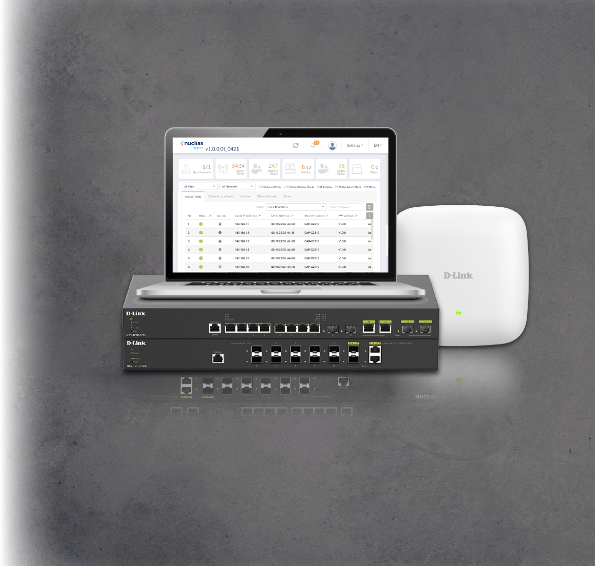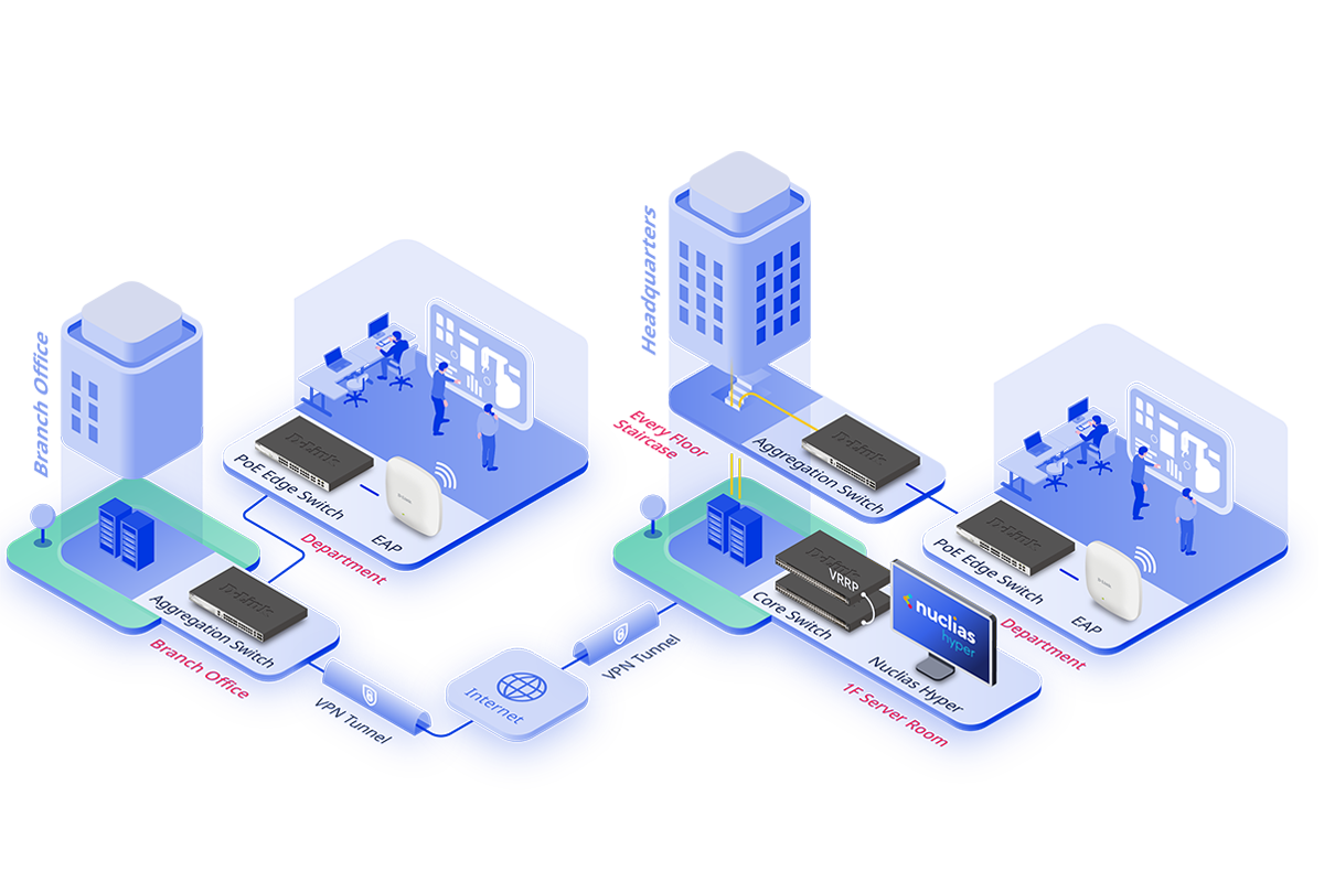Nuclias Hyper is an enterprise solution for large-scale networks, integrating the DNC-5000 software controller with compatible Nuclias switches and access points to provide unified monitoring, rapid deployment, and scalable expansion across distributed sites.