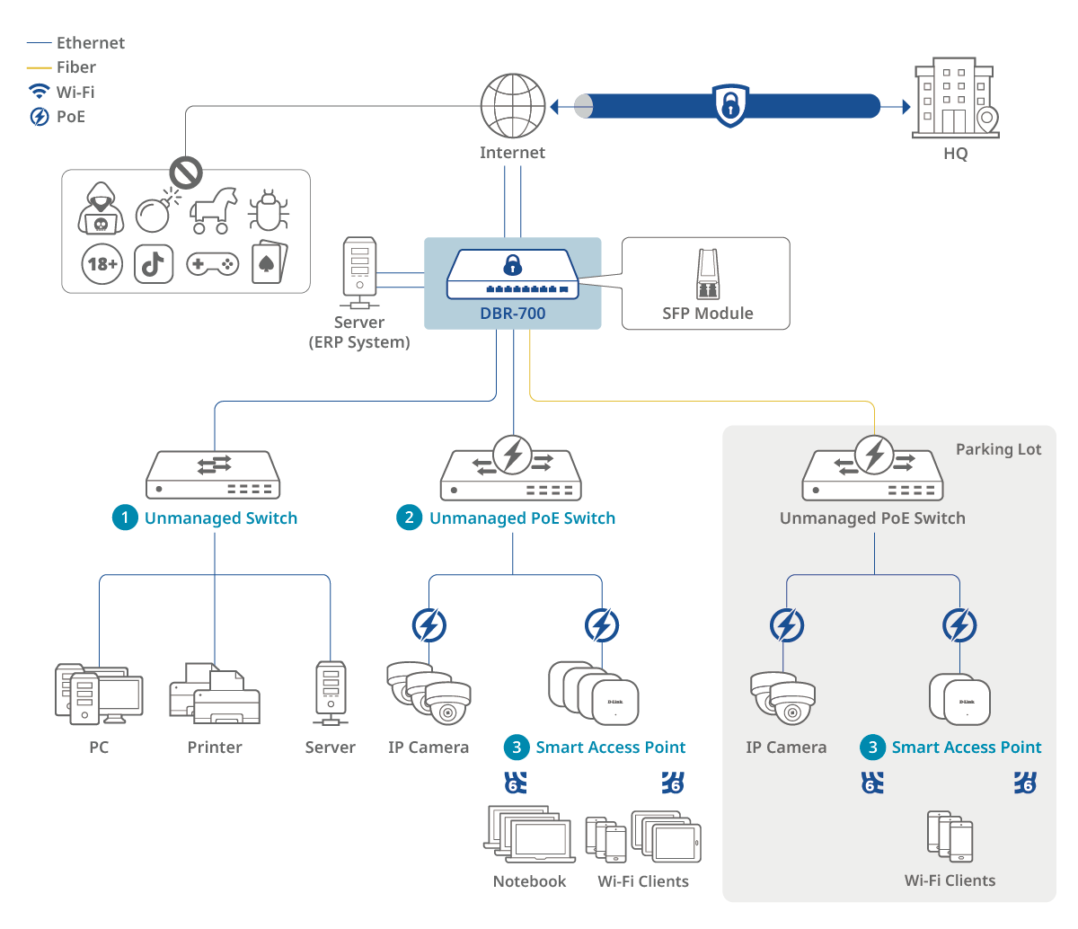 Via ett intuitivt webbgränssnitt övervakar DBR-700 hela nätverksstatusen centralt och hanterar enkelt konfigurationen av avancerade funktioner. Integrerad trådlös hantering stödjer upp till 15 accesspunkter i Smart AP-serien (DBR-X3000-AP), vilket förenklar administrativa uppgifter som radioinställningar, klientövervakning och åtkomstkontroll. Problemfri hantering och realtidsinsikter i nätverksaktiviteten hjälper småföretagare att förbättra den övergripande driftseffektiviteten.