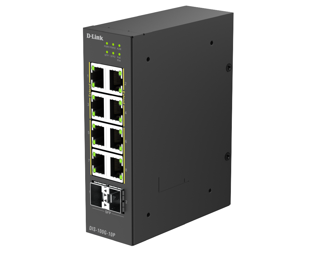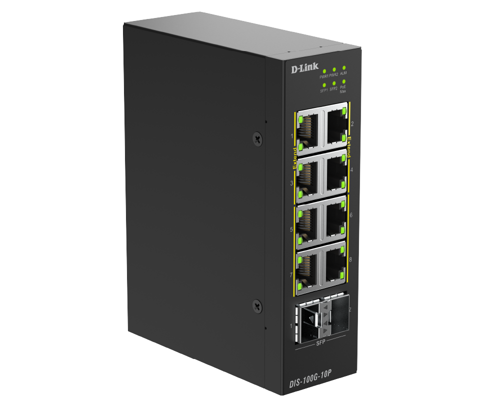 The DIS-100G-10P is an industrial unmanaged switch equipped with eight 1G PoE ports and two SFP ports, providing plug-and-play simplicity for deployment. The SFP ports support long-range data transmission, removing the distance limitations of traditional Ethernet cabling. With reliable, high-performance operation, it's well-suited for edge deployments in applications like HD surveillance, wireless access points, and more.