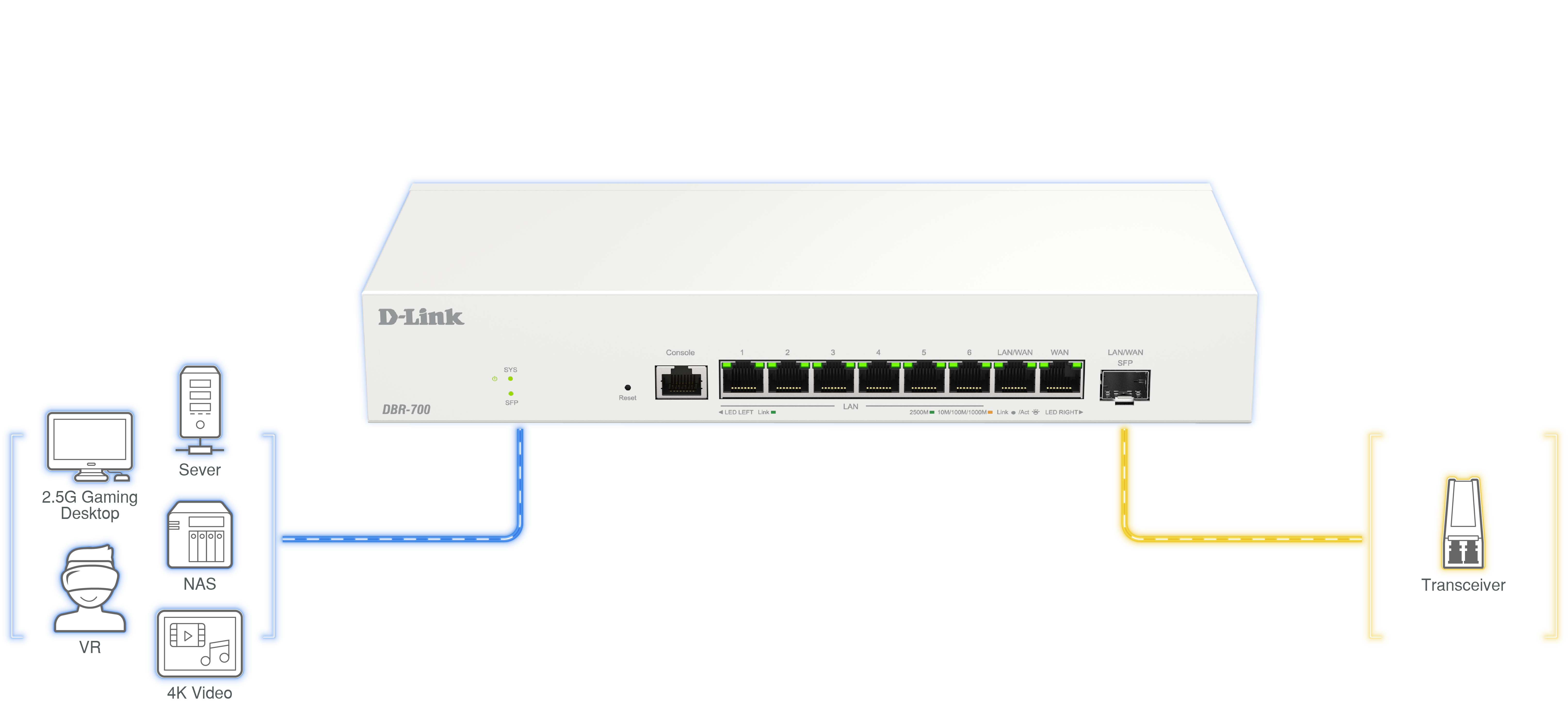 The DBR-700 features a 2.5G interface, providing higher bandwidth to support faster file transfers and lag-free, high-quality 4K/8K video streaming, enhancing daily productivity with more stable and reliable connectivity. The SFP (Small Form-Factor Pluggable) port enables long-distance data transmission, offering greater flexibility and scalability in network design. With the fiber port, businesses can easily scale their network without zone limitations.