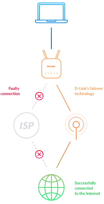 When your Internet Service Provider is having technical difficulties, the DWR-953V2 will jump into action by switching from connecting to the Internet via your fixed-line (Fiber/Cable/DSL) to via 5G cellular data - so you can keep working, playing or watching, as normal.