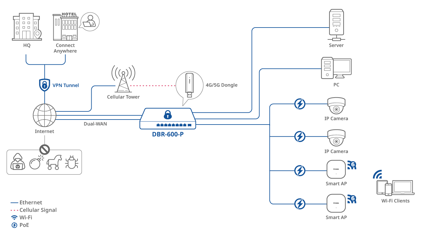 透過我們詳細的拓樸圖,了解 DBR-600-P 商用PoE路由器的功能。