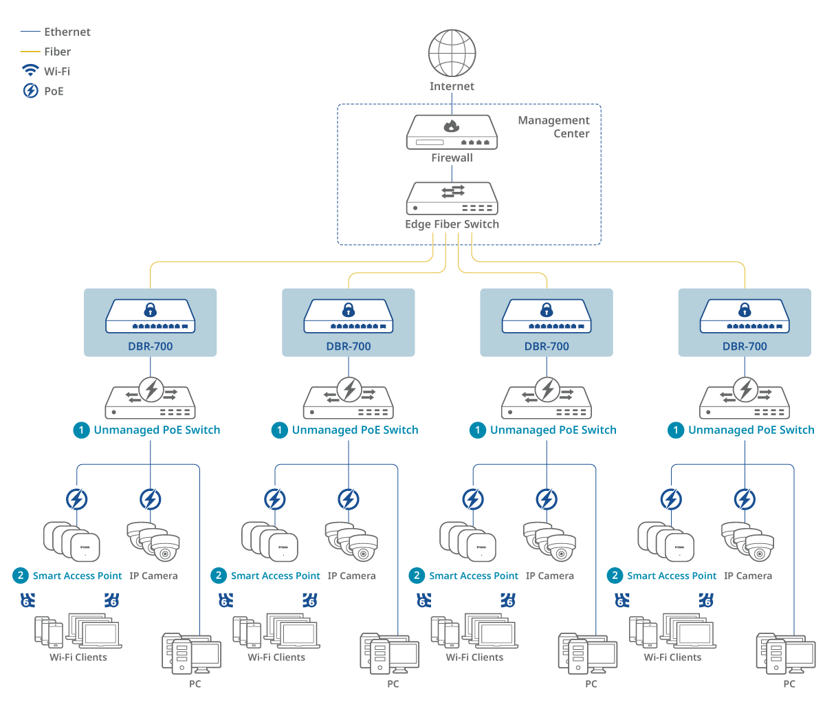 DBR-700 透過其 2.5G 高密度網路埠提供無縫連接,而 SFP 網路埠可實現遠距離、靈活的網路擴展。多個 WAN 網路埠提供可靠穩定的網路服務,有效平衡流量。VPN 通道允許使用者隨時加入辦公室網路,並確保網路限制以提高生產力。此外,內建 AP 管理系統提供對無線設備狀態和身份驗證的集中控制。