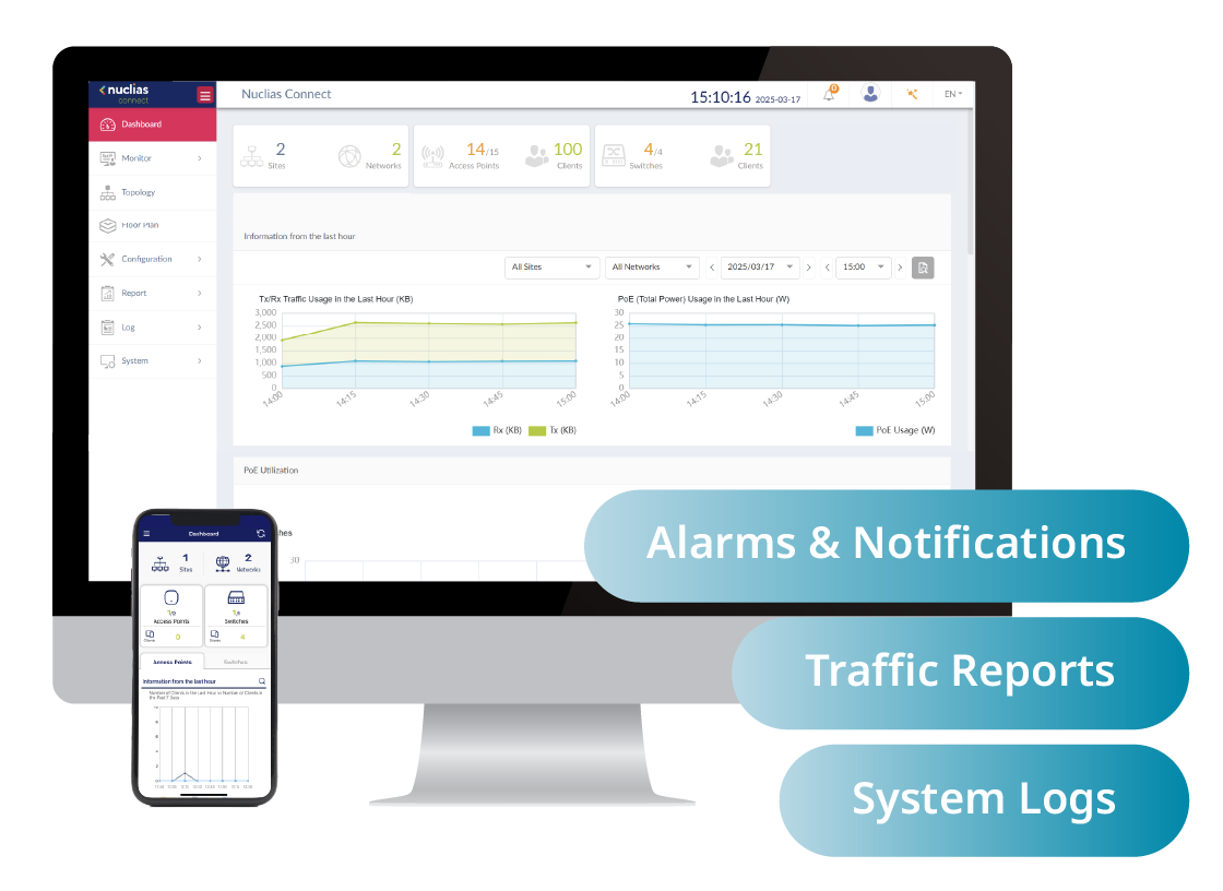 Monitor real-time network status, generate reports, and receive instant alerts from a centralized dashboard.
