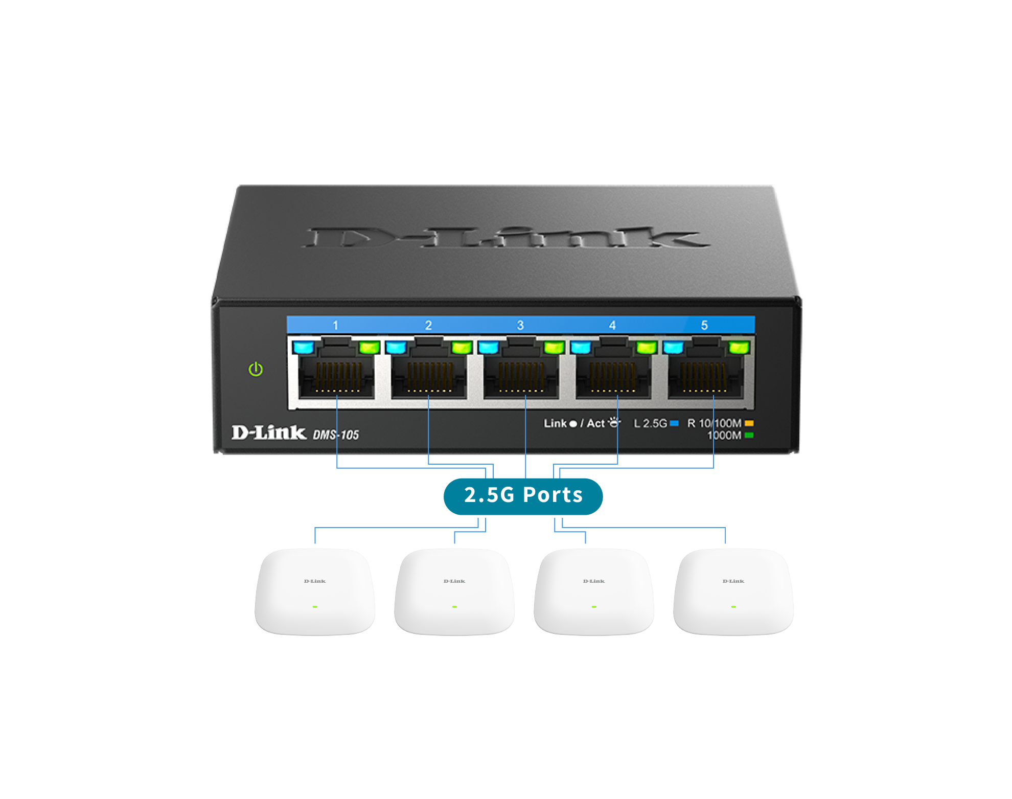 DMS-105 可自動偵測各網路埠所需的速度並自動協調網路流量,讓每個連網設備盡可能獲得最大速度。