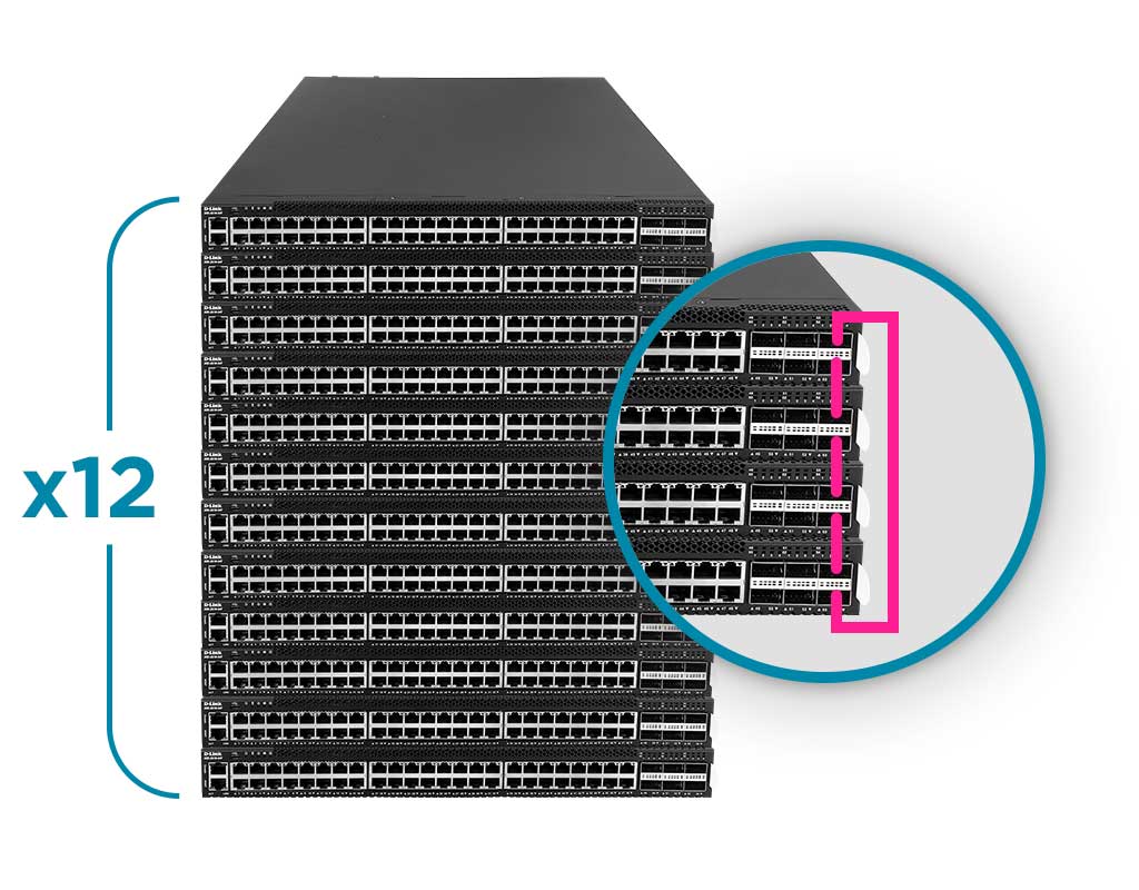 堆疊最多 12 台 DXS-3610 交換器,總堆疊頻寬高達 1200G (1.2T)。非常適合使用葉脊式或架頂式 (ToR) 架構的企業或園區應用的中小型資料中心。