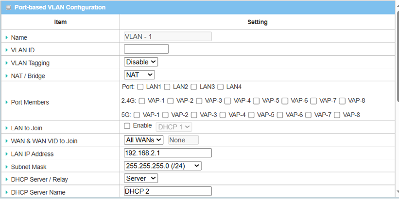2. VLAN Setup Configuration: