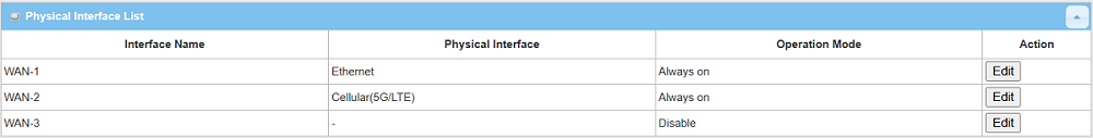 | Physical Interface | WAN-1 select Ethernet; WAN-2 select Cellular |