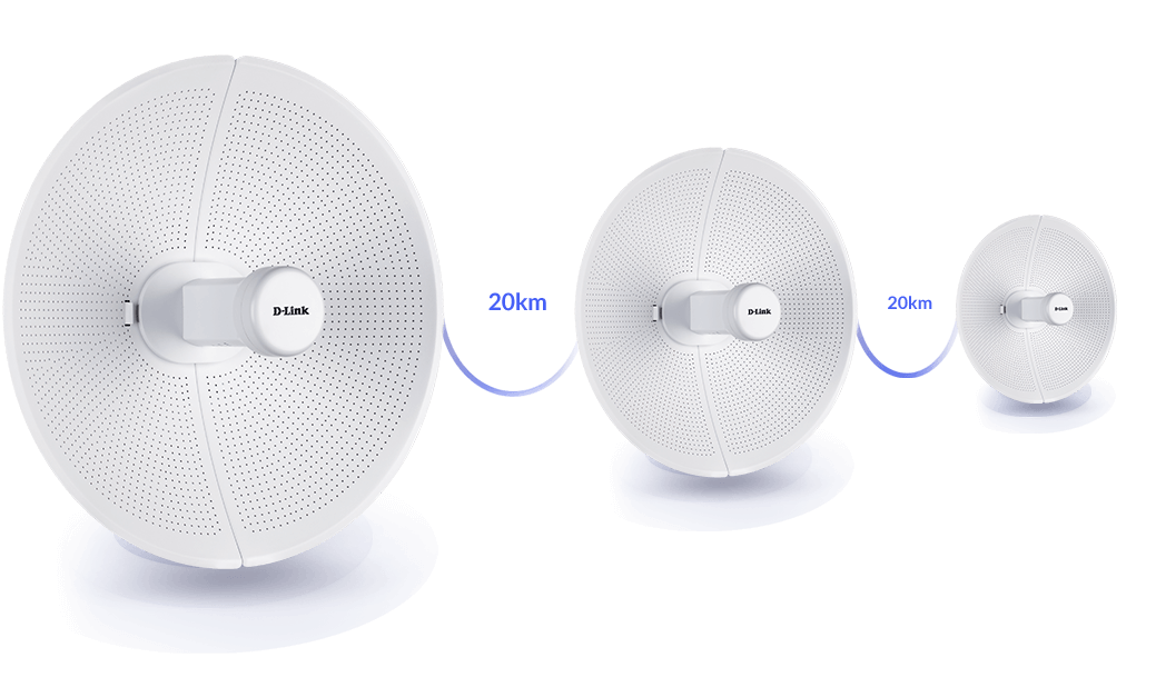 The DAP-3712 features state-of-the-art hardware, including powerful high-gain 23 dBi directional antennas that effortlessly extend the coverage of 5GHz wireless AC speeds of up to 867Mbps to distances of up to 20 km away.