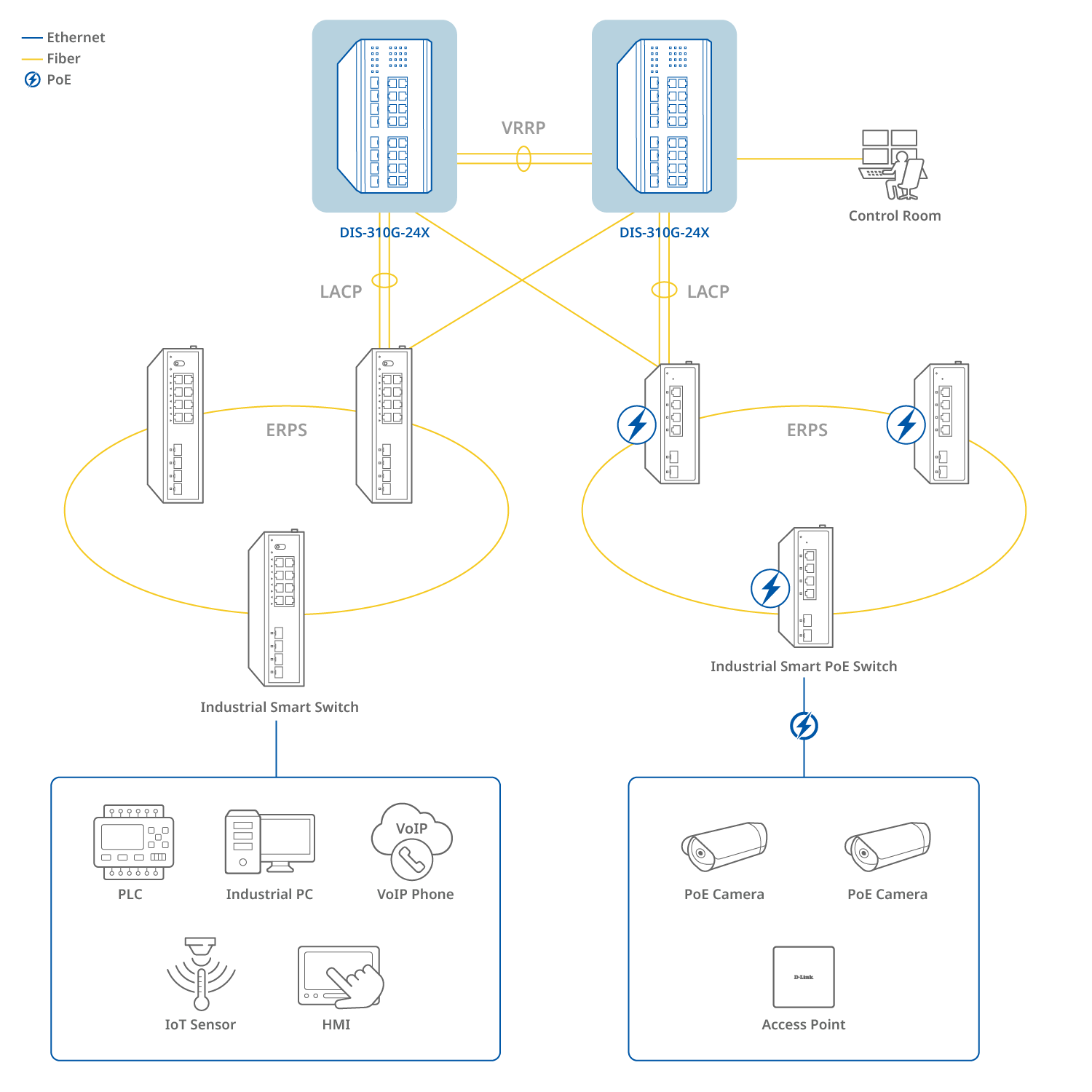 The DIS-310G-24X supports ERPS v1 and v2, enabling multiple ring topologies that prevent network loops while providing redundant paths for continuous connectivity. This ensures high network resilience, fast failover, and easy scalability.