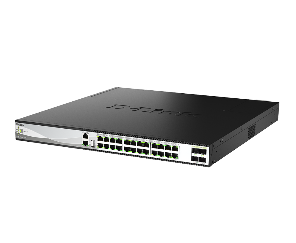 The DXS-3130-28P supports 802.3af/at/bt PoE standards, delivering up to 60 W per port with Perpetual and Fast PoE.