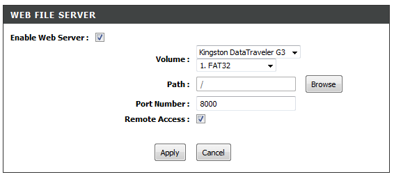 - Click Enable Web File Server. Select the Disk and Volume, the Path if you want to specify a folder to enable access to, note the Port Number (default is 8000) and tick Remote Access if you want to access from the Internet (in the address bar of your web browser write the WAN IP of your DSL-2750B and add :8000 directly after the last number in the IP Address.