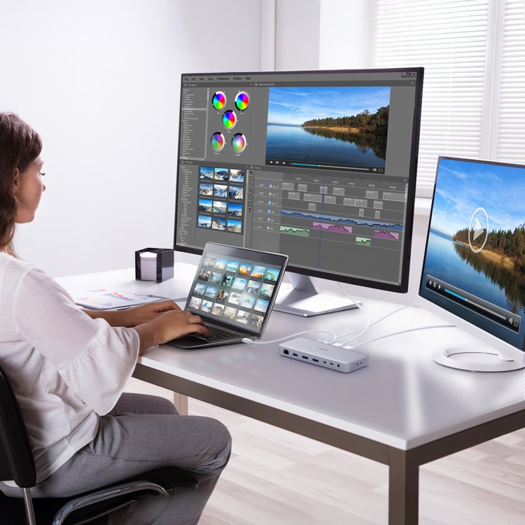 The DUF-901 equips your laptop with nine versatile ports to power both work and entertainment. Experience stable 2.5 Gbps Ethernet networking, stunning 4K/8K visuals through dual DP 1.4 and a multifunction USB-C port (DP Alt Mode, up to 8K), and lightning-fast transfers, 40 Gbps with USB4 and 10 Gbps with the auxiliary USB-A/C ports. An additional USB-A (480 Mbps) ensures compatibility with legacy devices, all within one sleek, powerful dock.