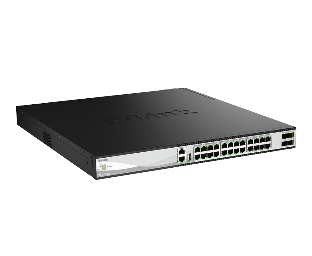 The DXS-3130-28P supports 802.3af/at/bt PoE standards, delivering up to 60 W per port with Perpetual and Fast PoE.